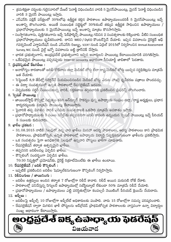 బదిలీల దరఖాస్తు గడువు 5 రోజులు పొడిగించాలి - యుటియఫ్ప్రభుత్వం ప్రకటించిన షెడ్యూల్ ప్రకారం ఉపాధ్యాయు బదిలీ దరఖాస్తు గడువు 2015 సెప్టెంబర్ 12 (ఈరోజు)తో ముగుస్తుంది. ఇప్పటికి జిల్లాల్లో ఖాళీ జాబితా సిద్ధంకాలేదు. రేషనలైజేషన్ పూర్తికానందున దరఖాస్తు గడువు 5 రోజు పొడిగించాని ఆంధ్రప్రదేశ్ ఐక్యఉపాధ్యాయ ఫెడరేషన్ (యుటియఫ్) అధ్యక్ష, ప్రధానకార్యదర్శులు ఐ.వెంకటేశ్వరరావు, పి.బాబురెడ్డి ఒక ప్రకటనలో కోరారు. రేషనలైజేషన్ పూర్తి అయితేనే ఎవరు బదిలీకి దరఖాస్తు చేసుకోవాలో ఉపాధ్యాయులకి తెలుస్తుంది. దరఖాస్తు గడువు ముగుస్తున్న జిల్లాల్లో జాబితా లేనందున ఉపాధ్యాయుల తీవ్ర ఆందోళనలో ఉన్నారు. ఈ దశలో దరఖాస్తు గడువు పొడిగించి వెంటనే ఖాళీ జాబితా, సర్ప్లస్ టీచర్ల జాబితా ప్రకటించేలా తగు చర్యలు తీసుకోవాలని విజ్ఞప్తి చేశారు.మోడల్ పాఠశాలలుగా గుర్తించిన అన్ని స్కూళ్ళకు 5గురు టీచర్లుండేలా పోస్టులు సర్దుబాటు చేయాలని యుటియఫ్ నాయకులు కోరారు.ఐ.వెంకటేశ్వరరావు, అధ్యక్షులుపి.బాబురెడ్డి, ప్రధానకార్యదర్శి
